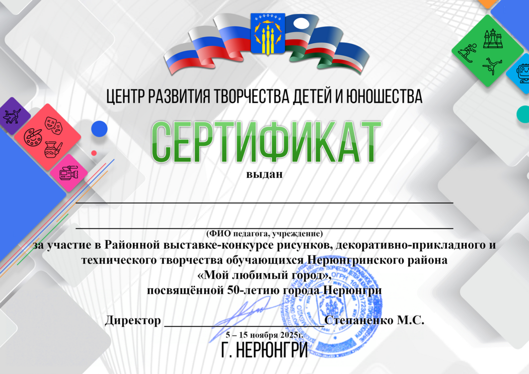 | «Нерюнгри - 50» | Обзорная экскурсия по выставке творческих работ, обучающихся Нерюнгринского района «Мой любимый город». Просмотр видеофильма «Прогулки в прошлое»- история развития города. Мастер-класс по созданию сувенира. | С 5 по 15 ноября 2025 | Четверг Пятница | 11.00-11.45 12.00-12.45 15.00-15.45 16.00-16.45 |